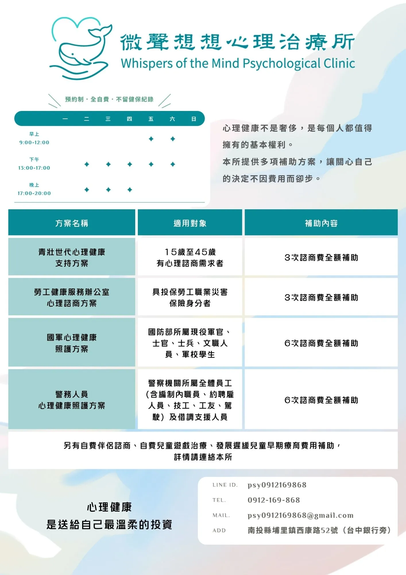 2026年,微聲想想心理治療所 承接多項政府心理健康方案,致力讓心理支持更容易被看見與使用。心理健康不是奢侈,而是每個人都值得擁有的基本權利。本所提供多元補助諮商服務,包括青壯世代心理健康支持方案、勞工健康服務辦公室心理諮商方案、國軍心理健康照護方案及警務人員心理健康照護方案,依據方案不同,可提供3至6次全額補助諮商。心理健康,是送給自己最溫柔的投資。歡迎與本所聯繫,了解適合您的心理支持方案。